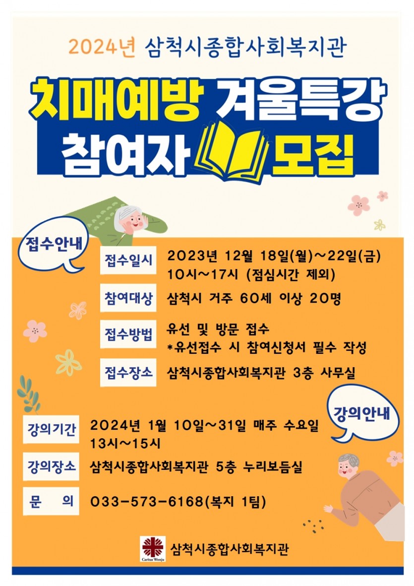 모집공고 2024년 치매예방 겨울특강 참여자 모집 페이지 정보 작성자 김재영 댓글 0건 조회 9,280회 작성일 23-12-14 14:11 목록 본문 페이스북 공유 트위터 공유 2024년 치매예방 겨울특강을 진행하오니 많은 참여 바랍니다. 이전글2024년 체력증진교실 겨울특강 참여자 모집 23.12.14 다음글2024년 겨울방학돌봄교실 꿈자람교실 참여자 모집 안내 23.12.11 댓글 0 댓글목록 등록된 댓글이 없습니다.