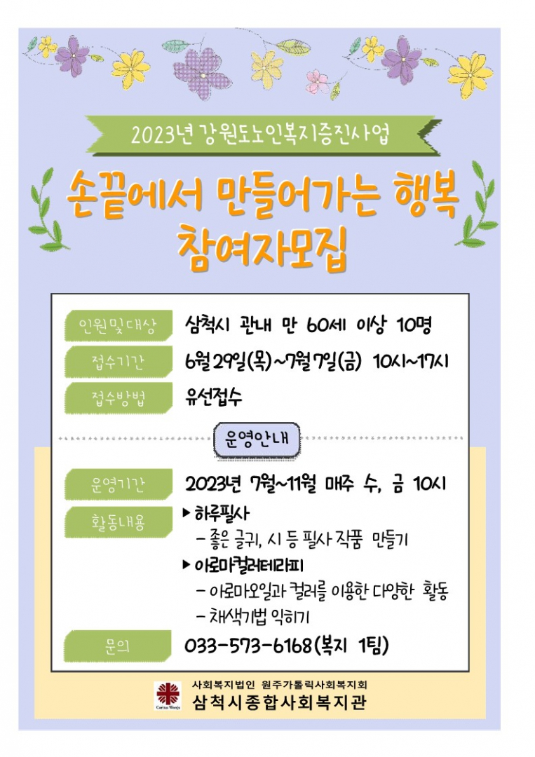 2023년 강원도노인복지증진사업 "손끝에서 만들어가는 행복" 프로그램 참여자 추가 모집합니다.가[삼척시종합사회복지관] 2023년 강원도노인복지증진사업 참여자 추모집 공고_1.jpg